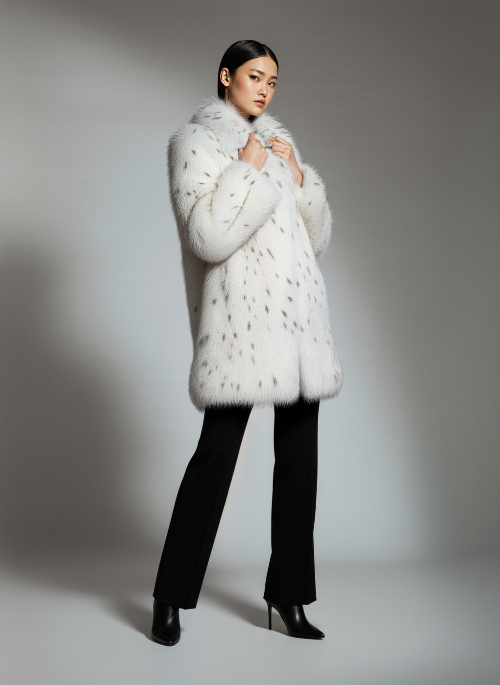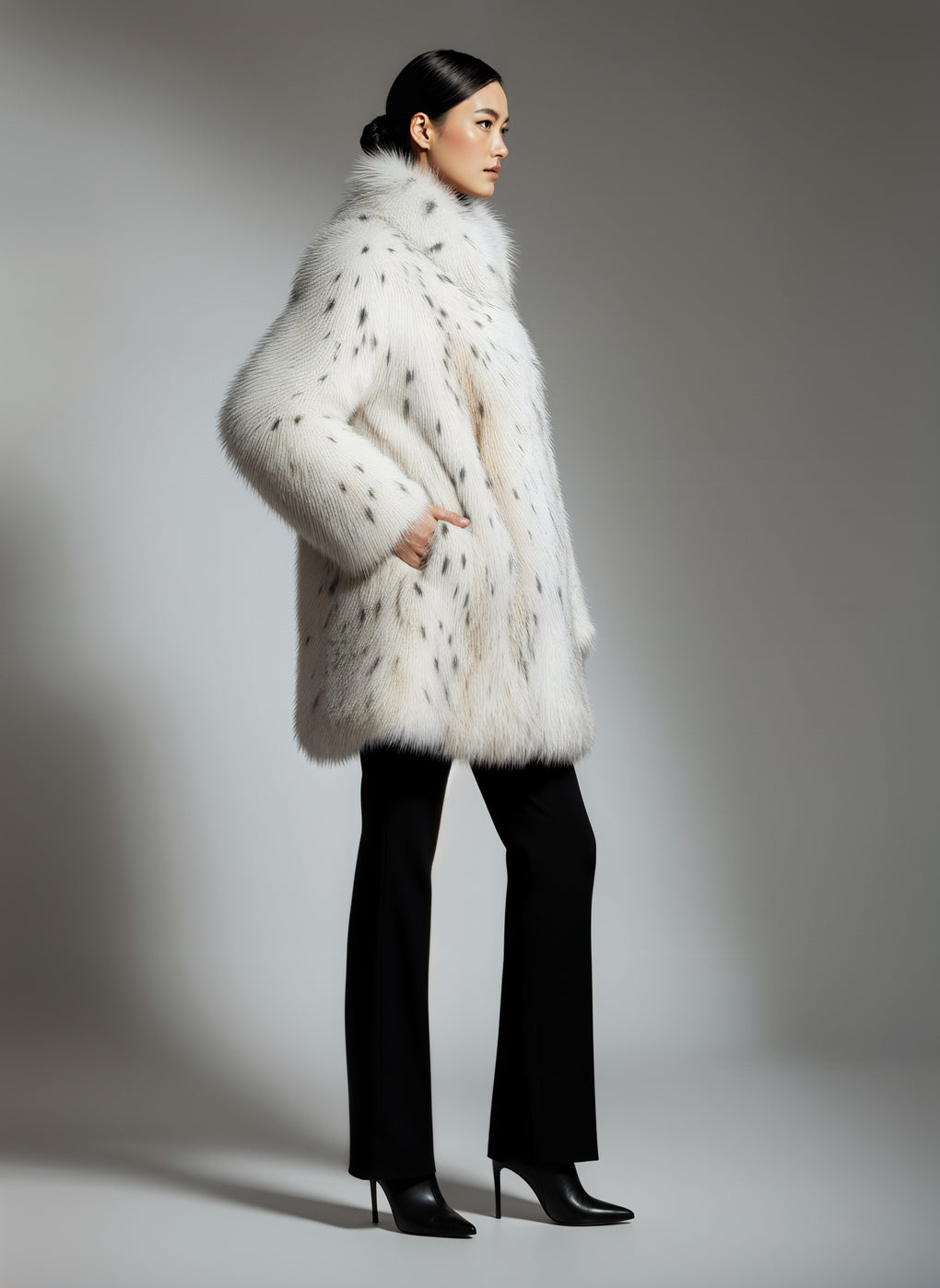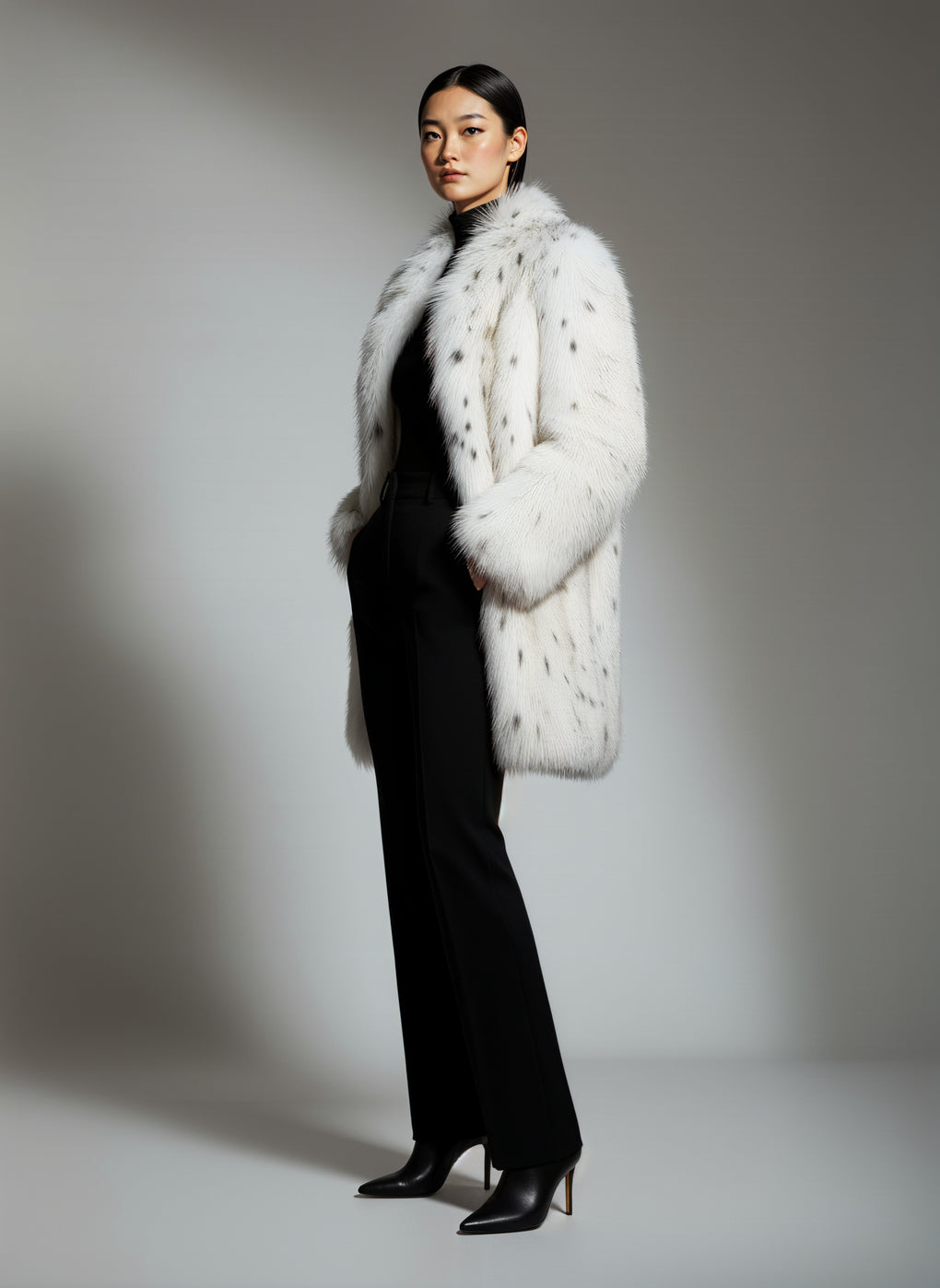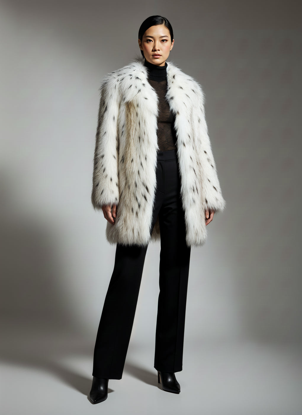 El Abrigo Lynx representa la máxima expresión del lujo natural. Su textura suave y su patrón moteado en tonos blancos y negros evocan la elegancia salvaje del invierno. Cada pieza es única, con un equilibrio perfecto entre volumen, ligereza y movimiento.