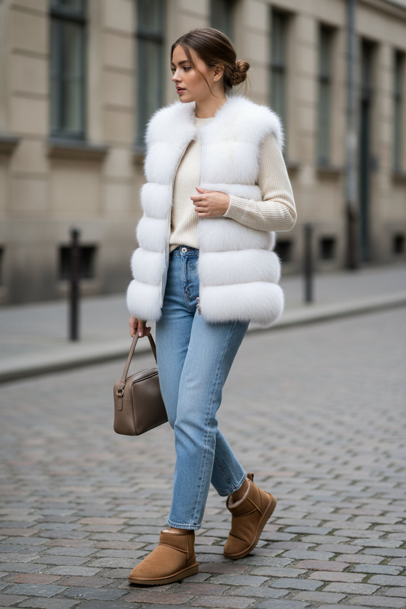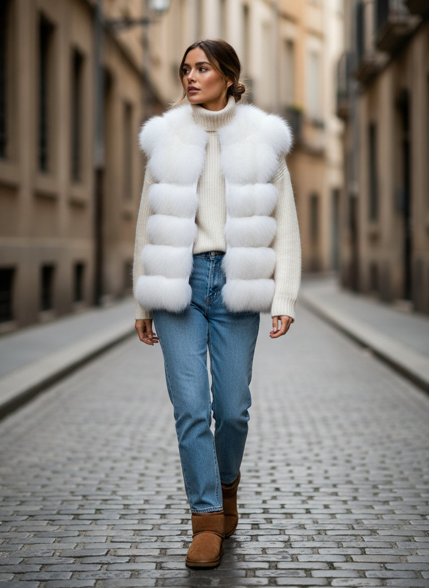 El Chaleco Asia representa la expresión más pura del lujo contemporáneo a través de una silueta limpia, elegante y absolutamente atemporal. Confeccionado en zorro natural ártico, su tonalidad blanco luminoso envuelve la prenda en una estética etérea y sofisticada, realzando la exquisitez de la piel y la perfección de cada franja.